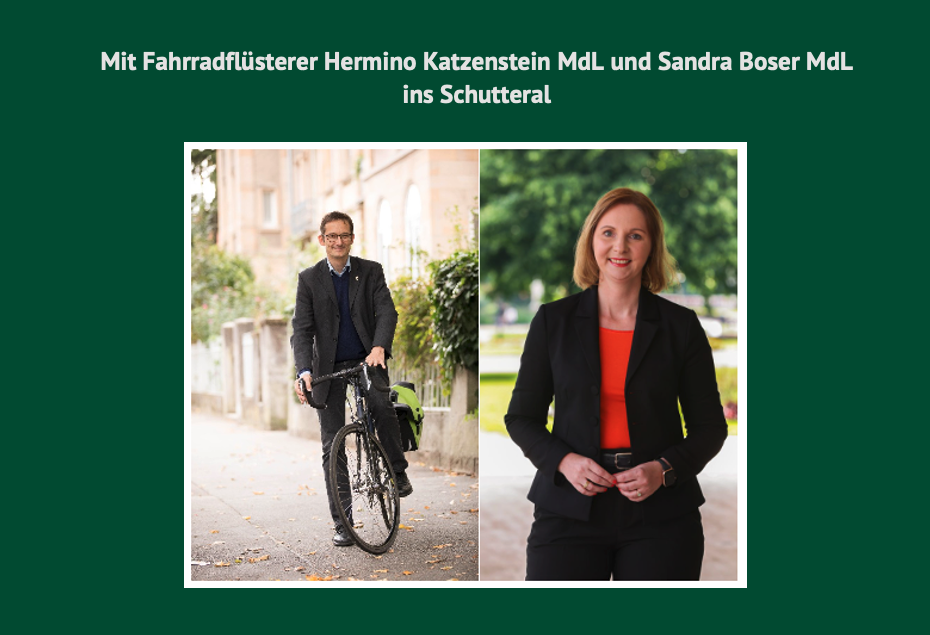 Fahrradtour ins Schuttertal mit Hermino Katzenstein MdL und Sandra Boser MdL am 27.10.2025 13. Oktober 202520. Oktober 2025 Zu einem Tag ganz im Zeichen einer nachhaltigen Mobilität mit den LandtagsabgeordnetenHermino Katzenstein und Sandra Boser lädt die Gemeinderatsfraktion von Bündnis 90/Die Grünen aus Seelbach am 27.10.2025 herzlich ein. Der Tag beginnt um 13:45 Uhr mit der Radexkursion von Lahr nach Seelbach. Treffpunkt istder Bikesharing Platz am Bahnhof Lahr. Von hier aus startet eine etwa 1,5-stündigeRadtour. Es werden verschiedene Zwischenstopps eingelegt und kritische Stellen für denRadverkehr unter die Lupe genommen sowie auch neue, gute Beispiele wie die Realisierungder Fahrradstraße an der Klostermatte angeschaut. Eingeladen sind alle interessierten Bürger*innen aus Lahr und dem Schuttertal, Radfahrer*innen,Schüler*innen, Lehrer*innen, Kommunalpolitiker*innen sowie Bürgermeister undUnternehmer*innen und alle Interessierten, um gemeinsam konstruktiv am Ausbaunachhaltiger Mobilität mitzuwirken. Die Teilnahme ist kostenlos. Die Fahrräder, E-Scooter etc. müssen verkehrssicher sein. Um eine kurze Rückmeldung per SMS/WhatsApp an 0171-2340987 mit wie vielen Personen Ihr/Sie teilnehmen wollt/wollen wird gebeten. Weitere Informationen zu diesem Tag und Infos, wie das Programm bei bei schlechtem Wetter abläuft, gibt es nach der Anmeldung. Einladung – Radexkursion nach SeelbachHerunterladen Teilen mit:Klick, um über Twitter zu teilen (Wird in neuem Fenster geöffnet)Klick, um auf Facebook zu teilen (Wird in neuem Fenster geöffnet) Ähnliche Beiträge